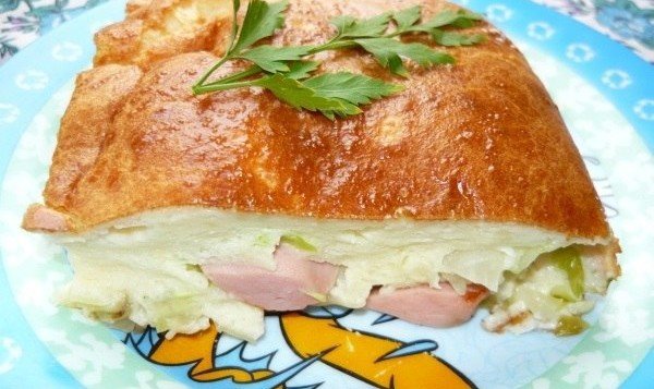Step 8 Cool the pie with cabbage and sausages a little and serve, cut into portions.