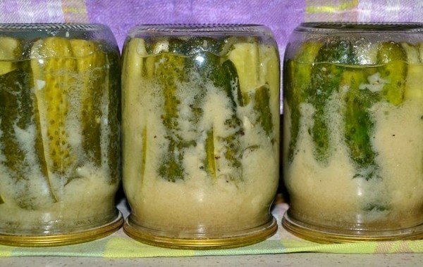 Step 4 Then get the slices of cucumbers from the brine and place them as densely as possible in sterilized jars, pour brine. It will be slightly cloudy because the mustard has time to dissolve. Sterilize jars with cucumbers in a water bath for 15 minutes, then roll up the lids tightly.