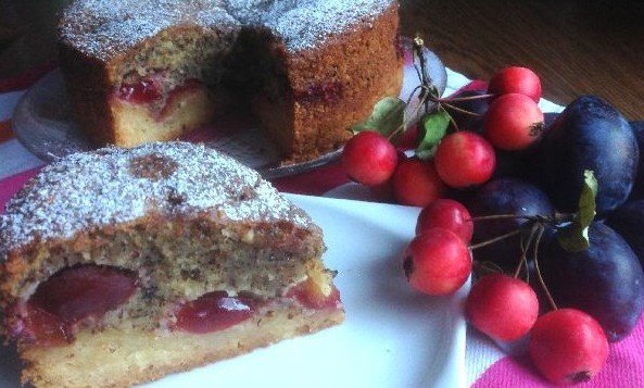 Step 4 Bake in an oven preheated to t 220 degrees for 10 minutes, until a slight blush. Remove the mold from the oven. Cook a nut dough. To do this, beat soft butter with sugar, add one egg at a time, constantly thoroughly mixing until smooth. Pour nuts mixed with flour and baking powder, mix well. Put walnut dough on baked cake, put halves of plums on top.