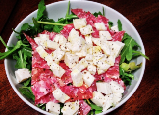 Salad with smoked sausage, cheese and arugula