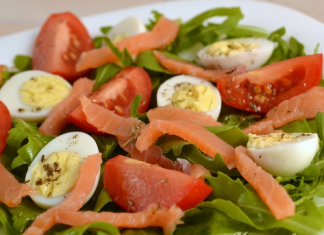 Arugula, tomato, quail egg and trout salad