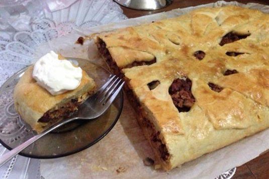 Step 3 The dough is divided into two parts (and uneven). Most of it needs to be rolled out - this is the bottom of our pie. Therefore, evenly rolled out the first part put on a baking sheet, which is covered with parchment. Put the whole stuffing. Roll out the smaller part and cover from above, fastening the corners with the base. Make holes in the center (for steam to escape). Lubricate the top with egg yolk to provide a golden crust to the pie. Bake in an oven preheated to t 180 degrees for about 30-40 minutes.