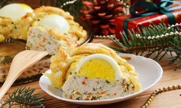 Step 6 Cook 2 eggs in a steep, peeled shell, cut each egg into 2 halves and press them into the dough well.
