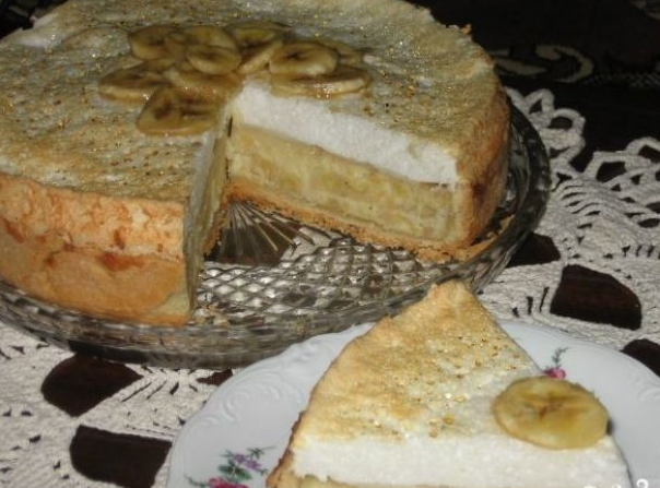 Step 4 Put banana slices at the bottom of the baked cake, pour cream on top. Bake 40 minutes in the oven at 180 degrees.