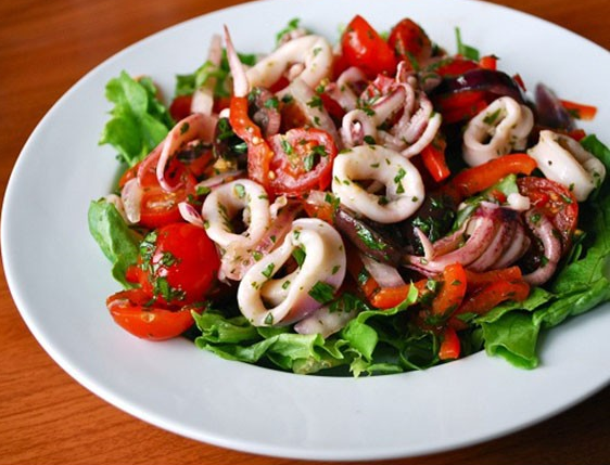 Step 5 Next, mix tomatoes, cucumbers, squids in a deep plate, salt, pepper to taste.