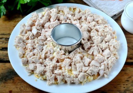Step 3 Put a serving ring on a large beautiful dish. Lay eggs around the ring, grease with mayonnaise.