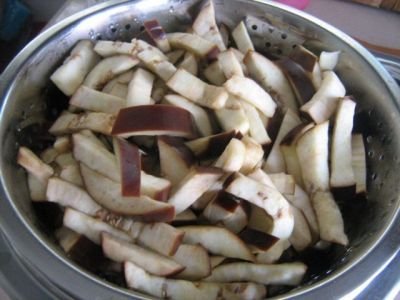 Step 4 Wash and chop the eggplant. Transfer to a pan and pour salted boiling water for 15 minutes, covering with a lid. Then drain the water and pour acidified boiling water again. Cover and let stand for 15 minutes. Drain the water by discarding the eggplant in a colander.