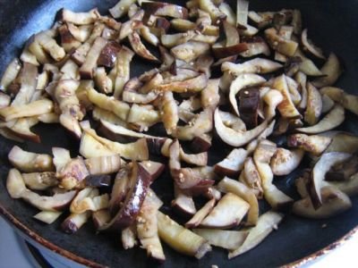 Step 5 Fry half the eggplant in a small amount of heated oil, spreading the “straws” in one layer.