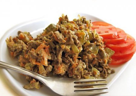 Step 6 Mix the liver, onions with carrots, cucumbers. Season with mayonnaise and mix.