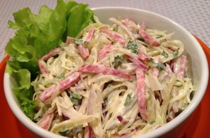 Step 5 Next, add sausage to the cabbage, cucumbers.