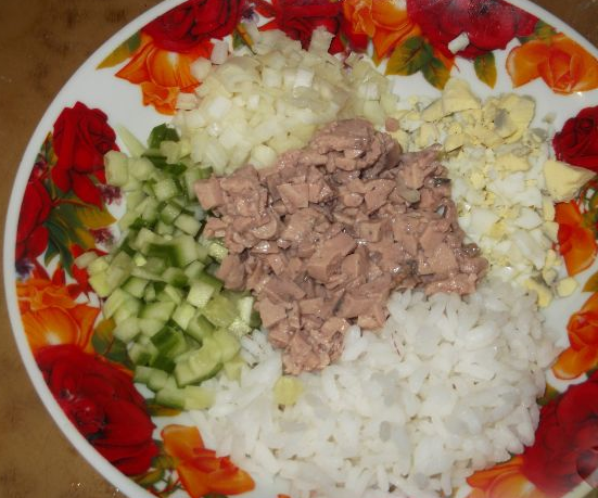 Step 6 Transfer cooked rice to a deep plate, add cod liver, onion, cucumber and egg.