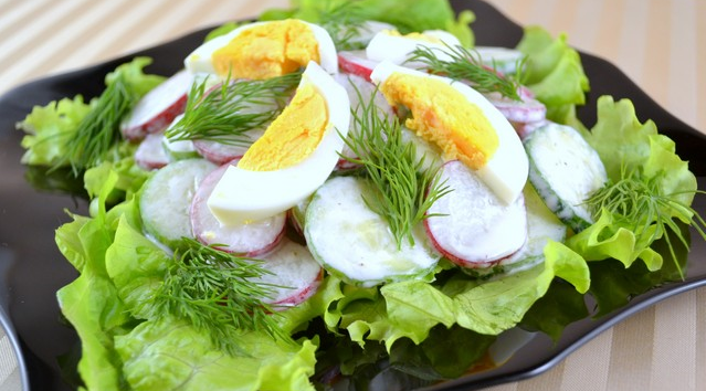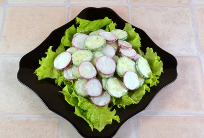 Step 4 Put radishes and cucumbers in a salad bowl. Add sour cream, salt, pepper and mix.
