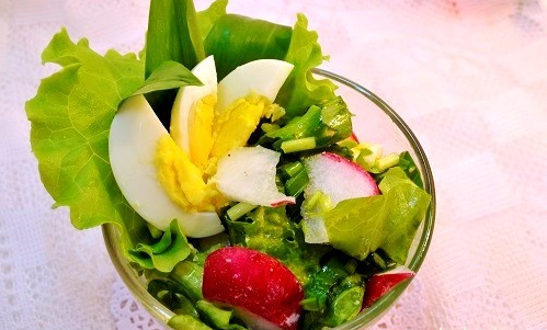 Step 9 Put the prepared spring salad with radish into portioned salad bowls. Garnish with leaves of wild garlic, sliced eggs and serve.