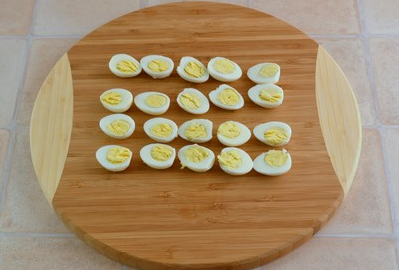 Step 1. Boil quail eggs in a steep, cool and peel. Cut each egg in half.