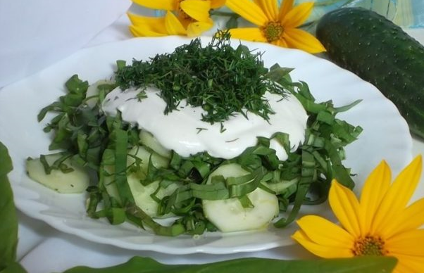 Step 3 Mix cucumbers with dill and sorrel. Mix sour cream with pepper, salt, mustard and sugar. Pour the resulting salad dressing.