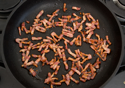 Step 1. Cut the bacon into small pieces and fry in a pan until crunchy (do not pour oil). Remove the bacon, put on a plate covered with a paper towel to remove excess fat.