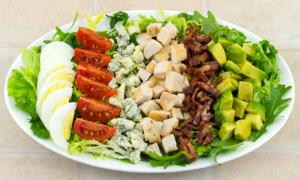 Step 8 Put lettuce leaves on a plate. Lay eggs, tomatoes, cheese, chicken, bacon and avocado in neat rows.