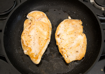 Step 2 Cut the chicken fillet lengthwise into two plates, salt, pepper on both sides. Fry in a pan where there was bacon on both sides over medium heat. Transfer to a paper towel and then cut into cubes.