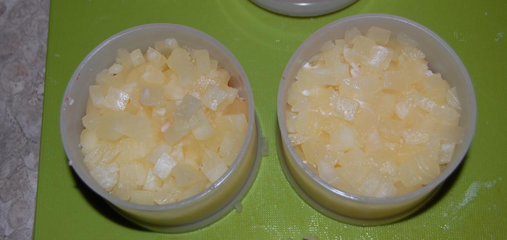 Step 5 The next layer is to put chopped pineapples on the shrimp, make a net of mayonnaise.
