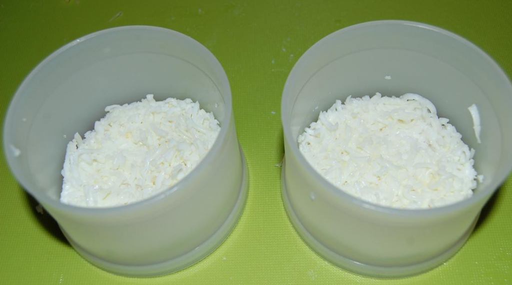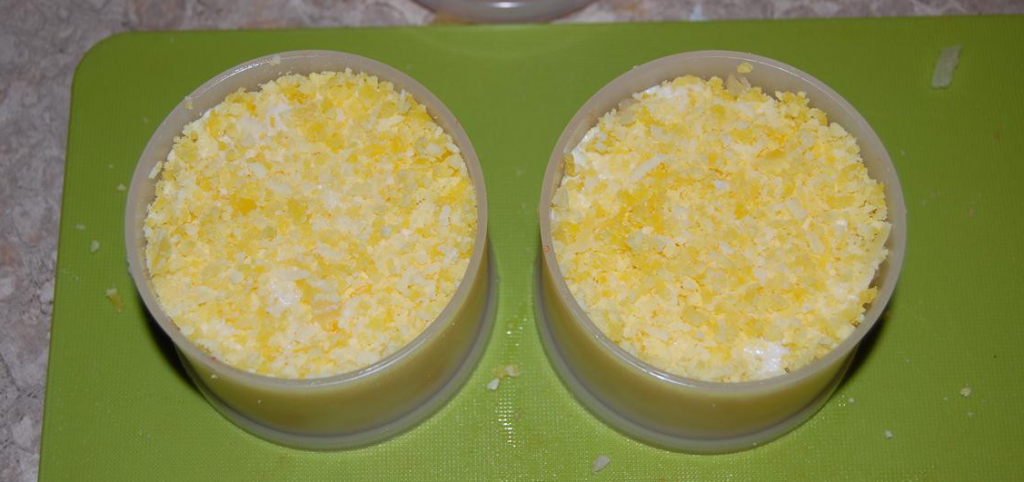 Step 7 Mix cheese grated on a fine grater with mayonnaise and fill the form to the brim.