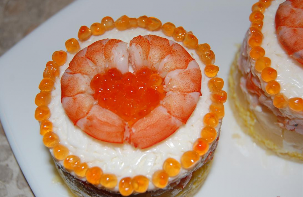 Step 4 Lay the next layer on the protein, shrimp. Make a net of mayonnaise on top.