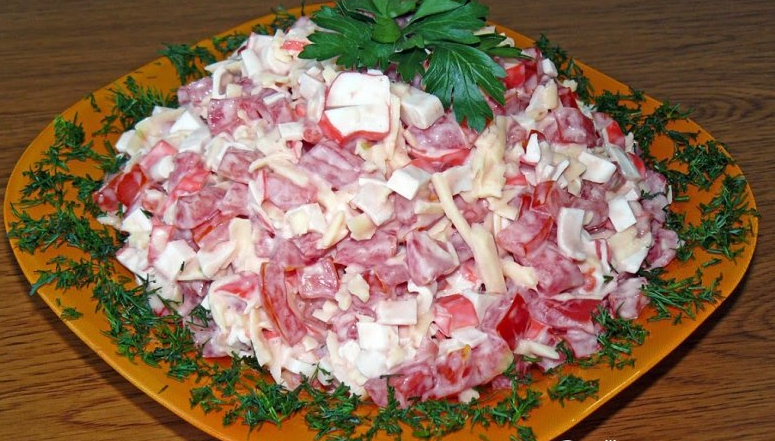 Step 7 Put all prepared ingredients in a deep plate, season with mayonnaise, mix. Salt to taste. Garnish with parsley.