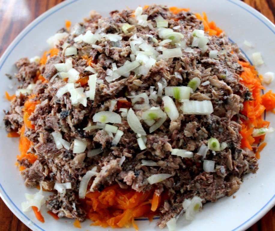 Step 6 Cut the onion into a small cube. The third layer, on the carrots, put saury and sprinkle with a beam.