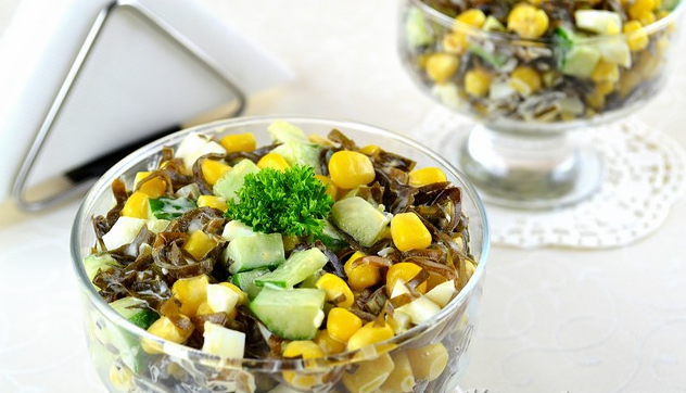 Step 3 Put seaweed, cucumbers, eggs and corn in a salad bowl. Add mayonnaise, salt and mix well.