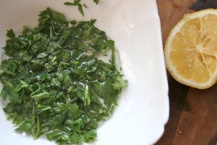 Step 9 Now prepare the dressing: mix chopped parsley, salt, pepper, half lemon juice and olive oil in a separate bowl.
