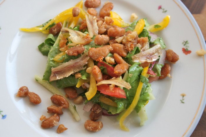 Step 11 Garnish vegetables laid out on a serving plate with warm beans, eggs and anchovies. Anchovies - a small fish marinated in vegetable oil and salt, has a very rich sweetish-spicy taste. In Mediterranean cuisine, it is often used as a seasoning, making the taste of dressing more intense.