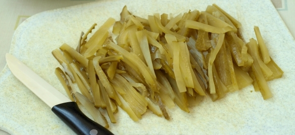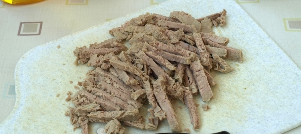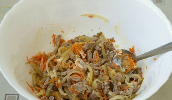 Step 6 Next, put meat, cucumbers, onions and carrots in a salad bowl. Squeeze the garlic through the garlic press.
