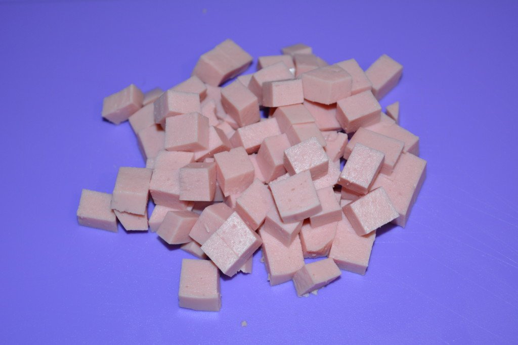 Step 1. Cut boiled sausage into small cubes.