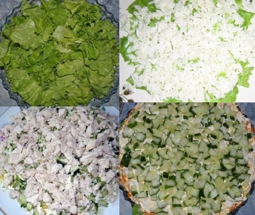 Step 7 Lay out the salad in layers. Put torn leaves of green salad in a beautiful flat salad bowl, slightly salt and grease with mayonnaise. Then spread the rice evenly with the first layer, grease with mayonnaise, then chopped chicken fillet, grease with mayonnaise, then onion and the last layer - these are chopped cucumbers Grease with mayonnaise.