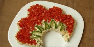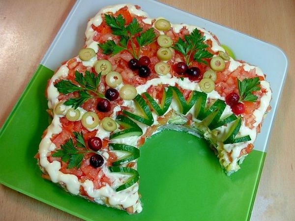 Step 11 On the contour of the salad, make a stroke of mayonnaise, garnish with olives, corn, pomegranate seeds and parsley leaves. You can also use berries cranberries or viburnum for decoration.
