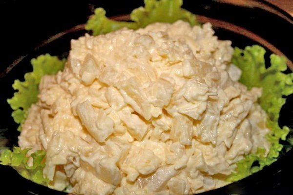 Step 1. Boil chicken fillet in salted water, cool and cut into small pieces. Put in a salad bowl and top with mayonnaise.