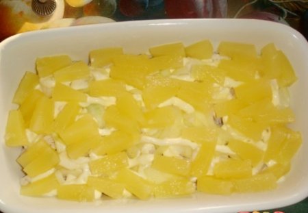 Step 2 Dice the pineapples and put on top on the chicken fillet, greased with mayonnaise. Also grease pineapple with mayonnaise.