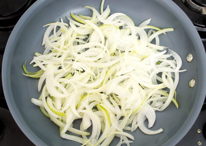 Step 1.Peel the onion, cut into thin half rings. Heat a little vegetable oil in a pan, put onions.