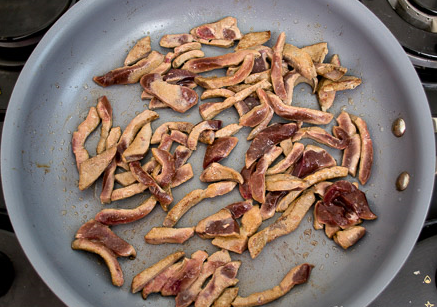 Step 10 Heat a small amount of oil in a frying pan, lay out the liver. Fry for 2-3 minutes with active stirring (note the time), no more, it is with rapid frying over high heat that the liver turns out to be soft and soft.