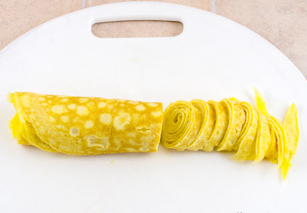 Step 7 Fry the rest of the eggs in the same way. Fold the pancakes into a stack, roll them into one roll and cut them into centimeter strips.