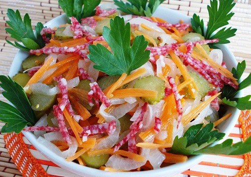 Step 2Cut smoked sausage into very thin strips so that its hardness is not felt in the salad.