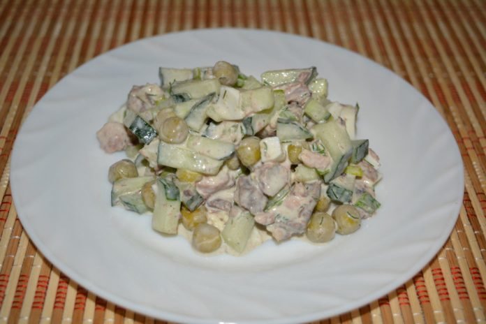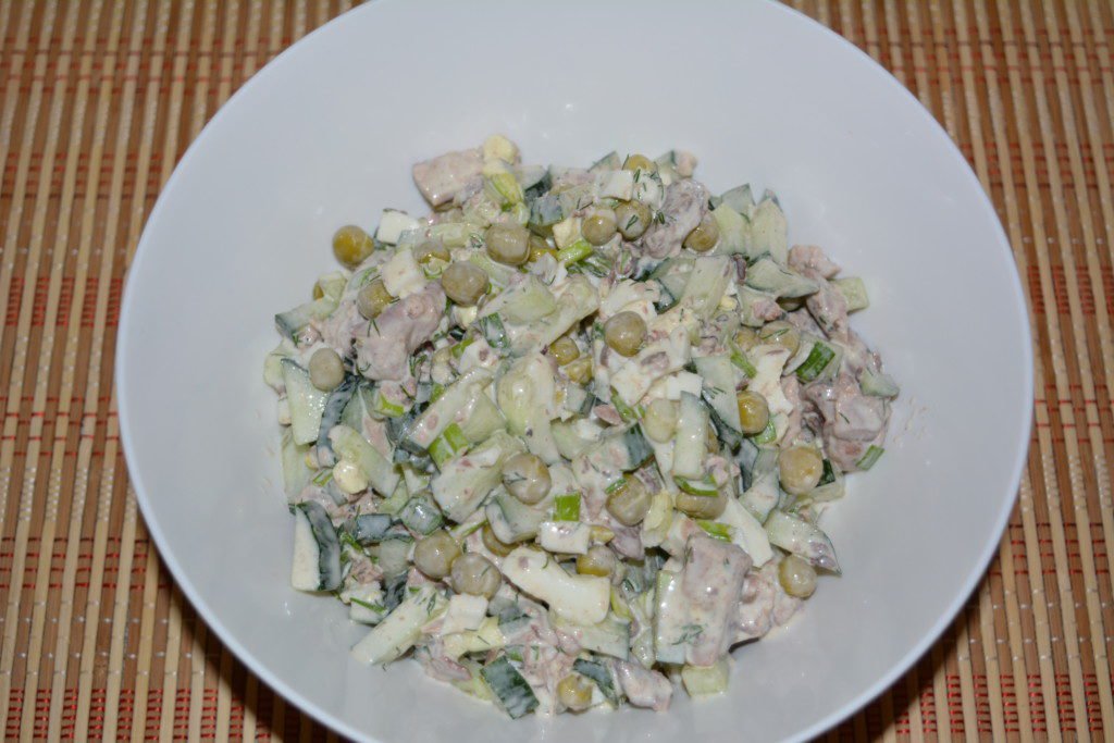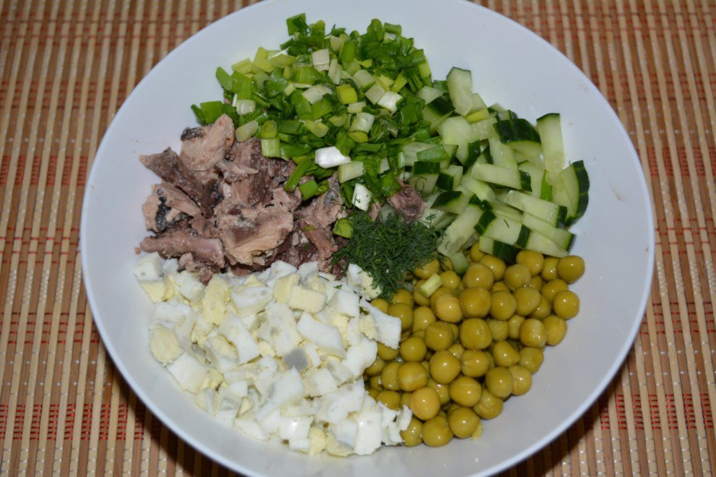 Step 6 Salt the salad, season with mayonnaise and mix gently so as not to damage the pieces of tuna.