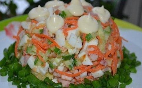 Step 5 Mix all prepared ingredients and add Korean carrots. Salad, pepper, season with mayonnaise. Put the salad on a dish, garnish with chopped green onions.