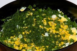 Step 5 Put rice, eggs, crab sticks, chopped green onions, dill in a salad bowl. Stir, salt to taste.