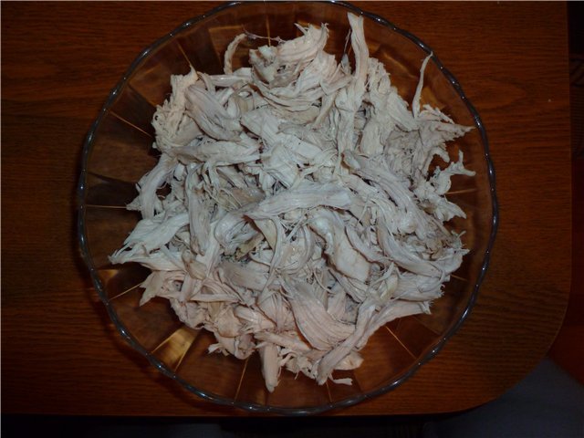 Step 2 Boil the chicken breast in salted water until tender. Cool and disassemble into fibers.