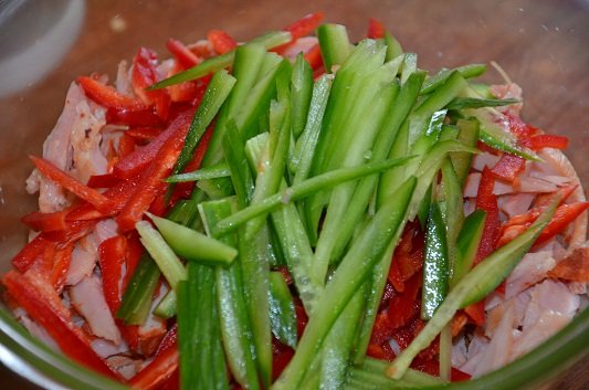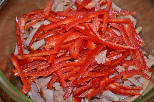 Step 1. Boil chicken breast in salted water, cool, disassemble into fibers.