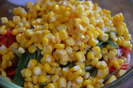 Step 5 Add corn, salt, pepper, mustard. Mix everything.