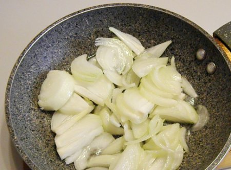 Step 1. Cut the onion into thin half rings, fry in vegetable oil. Salt, pepper and cool.