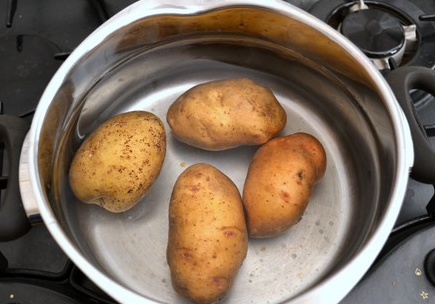 Step 1. Boil the potatoes in their skins in salted water, until cooked. Cool.