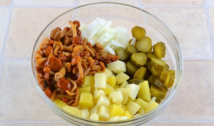 Step 5 Put potatoes, mushrooms, cucumbers, onions in a salad bowl. Pour with vegetable oil, mix, add salt if necessary.