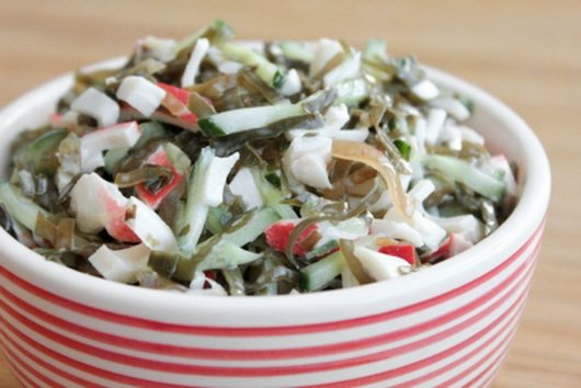 Step 5 Mix crab sticks, seaweed, lettuce, eggs. Season the salad with mayonnaise and mix.